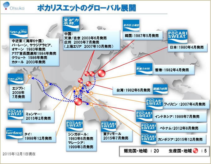 カンボジアで販売される「ポカリスエット」は韓国にある大塚グループ会社・東亜大塚の工場で製造された製品で、カンボジアの流通代理店を通じて販売。これにより「ポカリスエット」は、タイ(1998年12月より販売)を含む世界20カ国・地域での展開となります。