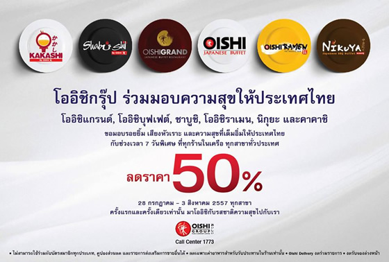タイで日本料理レストランを展開するOISHIグループが2014年7月28日から8月3日までの7日間、タイ全国の店舗にて50パーセント割引を行います。