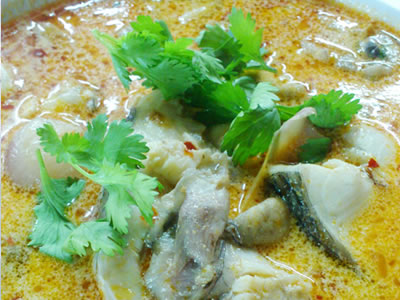 [タイ語]ต้มยำปลา トムヤムプラーは辛くてすっぱい魚のスープ。写真はココナッツミルクの入ったスープでナムコンと言われる。ココナッツミルクの入っていないスープはナムサイ。