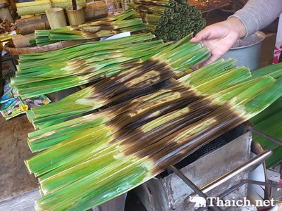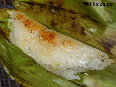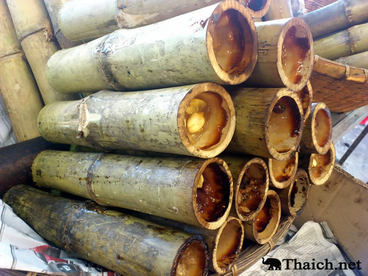 [タイ語] ข้าวหลาม カオラームとはココナツミルクなどで甘く味付けをしたモチ米(カオニャオ)を竹に詰めて炭火で焼いたもの。竹の良い香りが食欲をそそる。