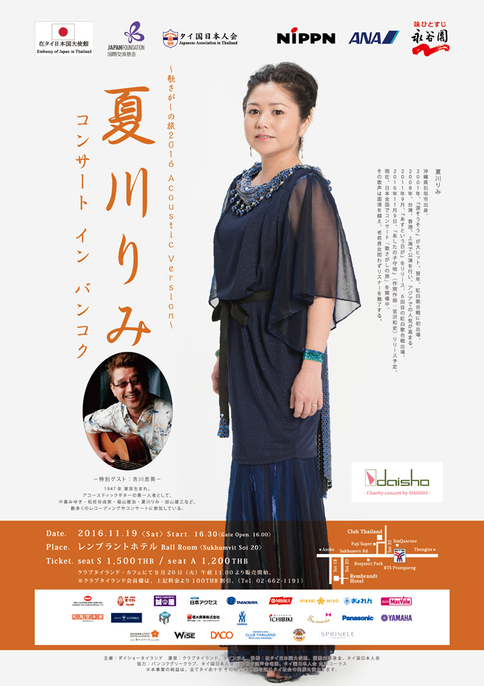 2016年11月19日にバンコク・レンブラントホテルで開催予定だった沖縄県石垣市出身の歌手・夏川りみさんのタイ初のコンサート「夏川りみ