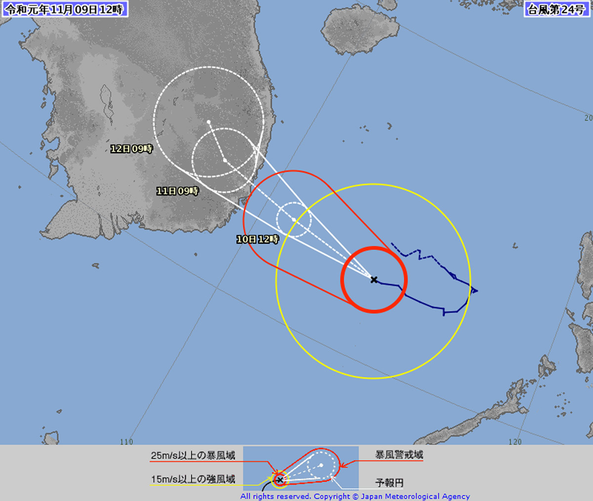 2019年11月5日午後9時に、南シナ海で発生した台風24号「ナクリー」は、11月9日午前10時現在南シナ海上空にあり、時速15キロで北西へ移動中。11日にはベトナムに、12日にはカンボジアに上陸する見込みです。