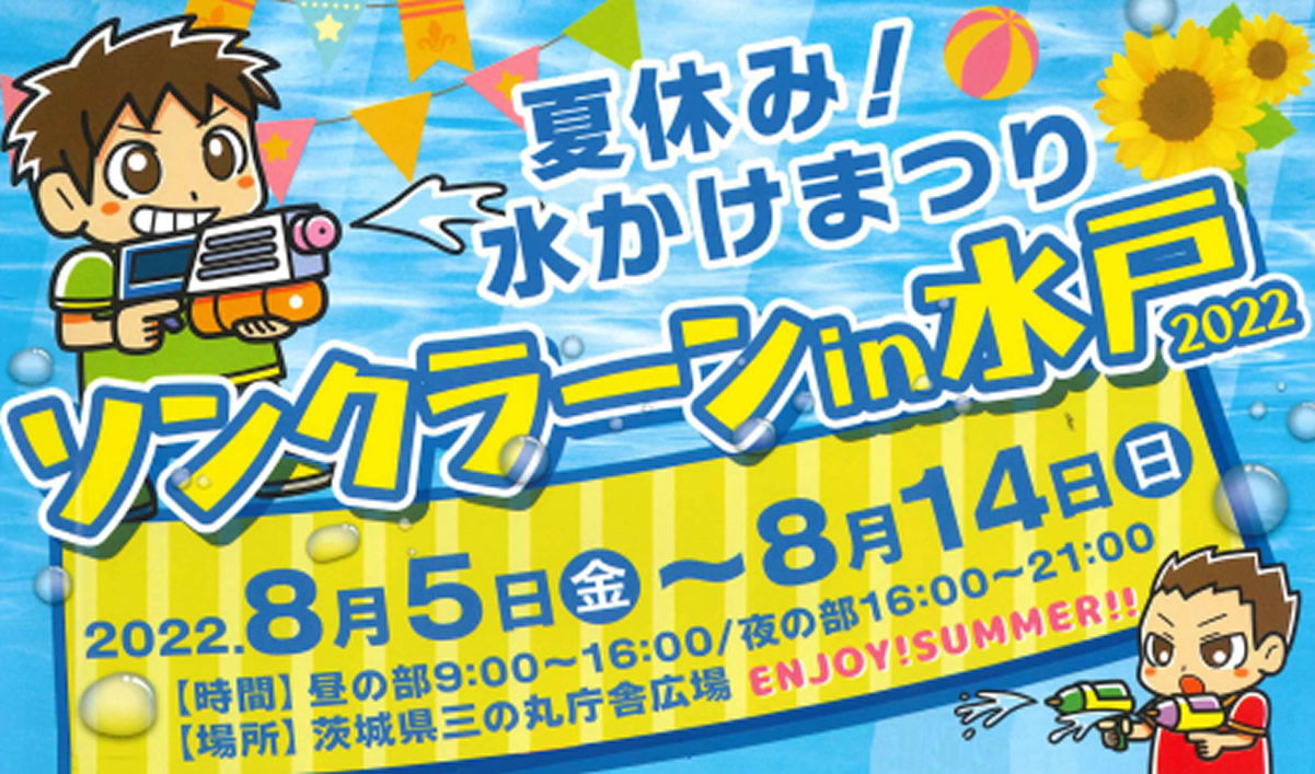 茨城県水戸市の三の丸庁舎広場では、2022年8月5日(金)から8月14日(日)まで、水鉄砲をはじめとした水遊びや,かき氷や焼きそばといった飲食などが楽しめるイベント「夏休み!水かけまつり ソンクラーン