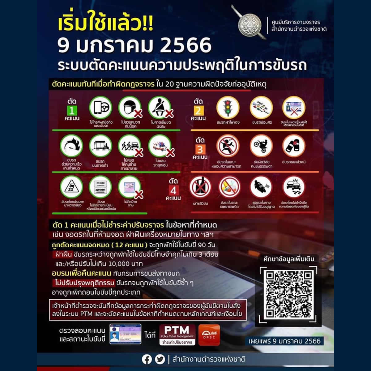 実施延期が続いていましたが、タイでは2023年1月9日(月)より、運転免許証の減点制度がスタート。運転免許証保持者には、最初は12ポイントが与えられ、違反が見つかるたびに減点されます。減点は、違反の度合いによって4段階に