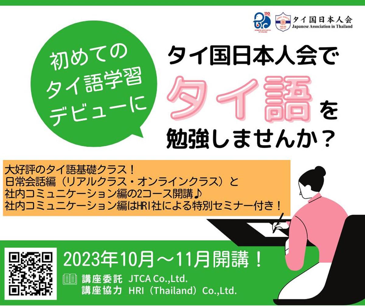 タイ国日本人会は、2023年10~11月の期間にてタイ語基礎クラス(日常会話編・社内コミュニケーション編)を再び開講します。