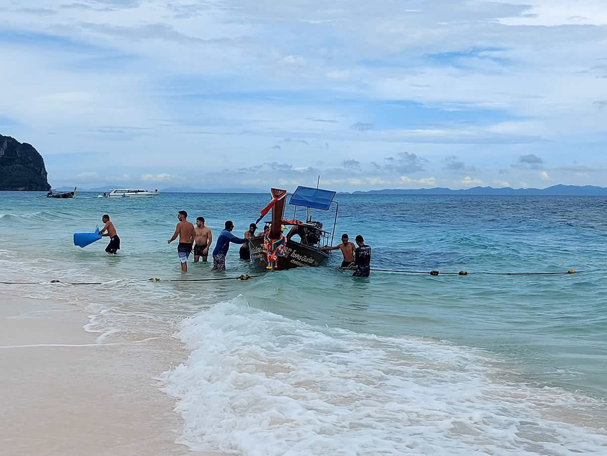 2023年11月17日朝、タイ南部クラビ県のピピ島からバンブー島に向かったロングテールボートに浸水。沈みゆくロングテールボートの外国人乗客6名は、無事に保護されています。