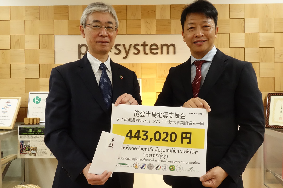 パルシステムが宅配で届けるタイ産「エコ・バナナ(ホムトン)」の生産者から、能登半島地震で被災したみなさんに支援金44万3,020円が寄せられました。募金は先方の意向からパルシステムが1月に呼びかけた能登半島地震緊急支援募