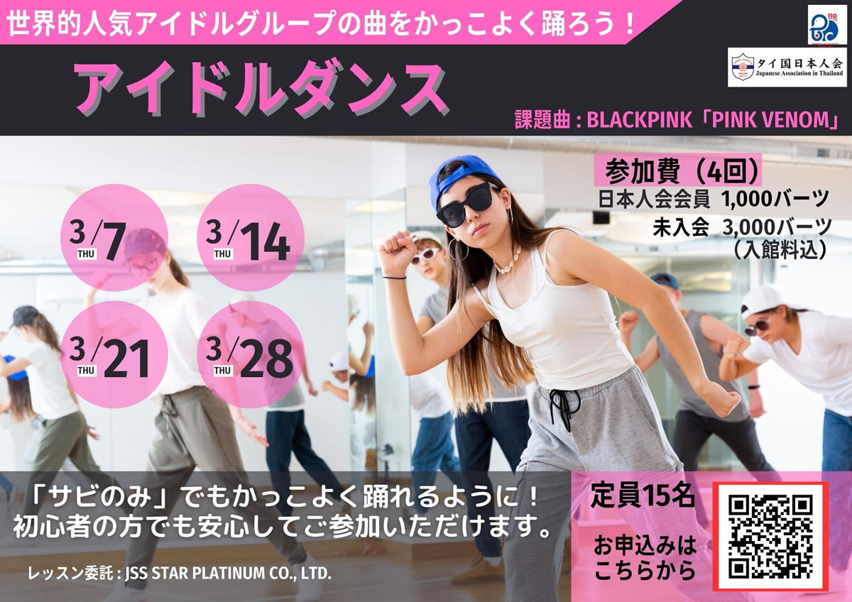 タイ国日本人会は2024年3月7日~28日まで、アイドルグループの曲をかっこよく踊るためのダンスレッスンを開催します。定員は先着15名。申し込み締切は3月1日(金)16:00までです。