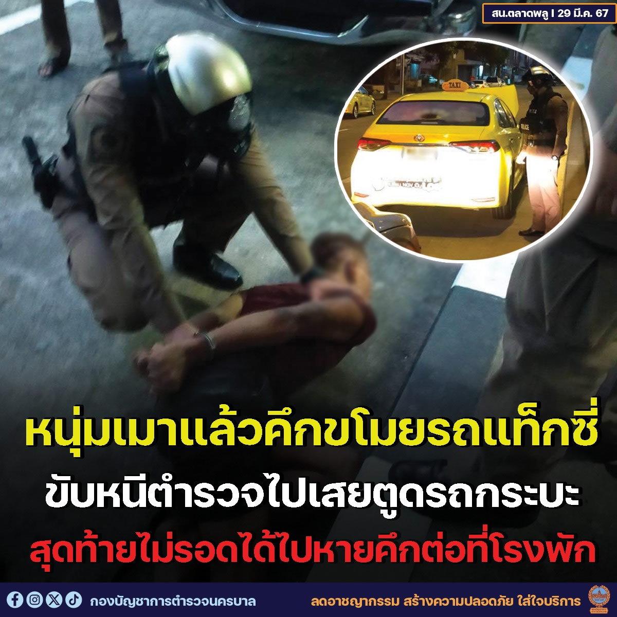 タイ警察は2024年3月29日、バンコク都内で酒に酔ったような男がガソリンスタンドで待機中のタクシー車両を盗んで逃走したとの通報を受け、警察官が現場へ向かいました。
