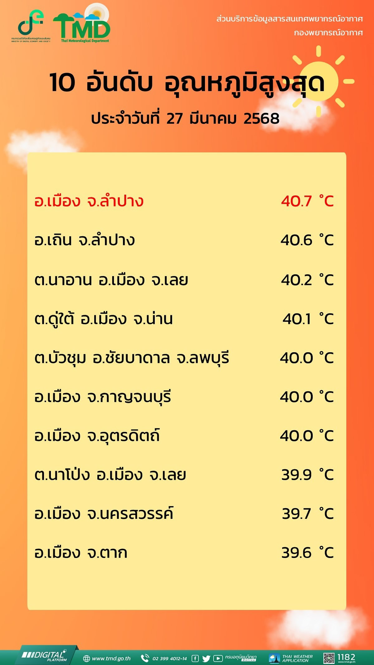 タイ気象局は、2025年3月27日に全国で観測された最高気温ランキングを発表しました。最も高かったのは、ランパーン県ムアン郡の40.7℃で、北部を中心に40℃を超える地点が相次ぎました。