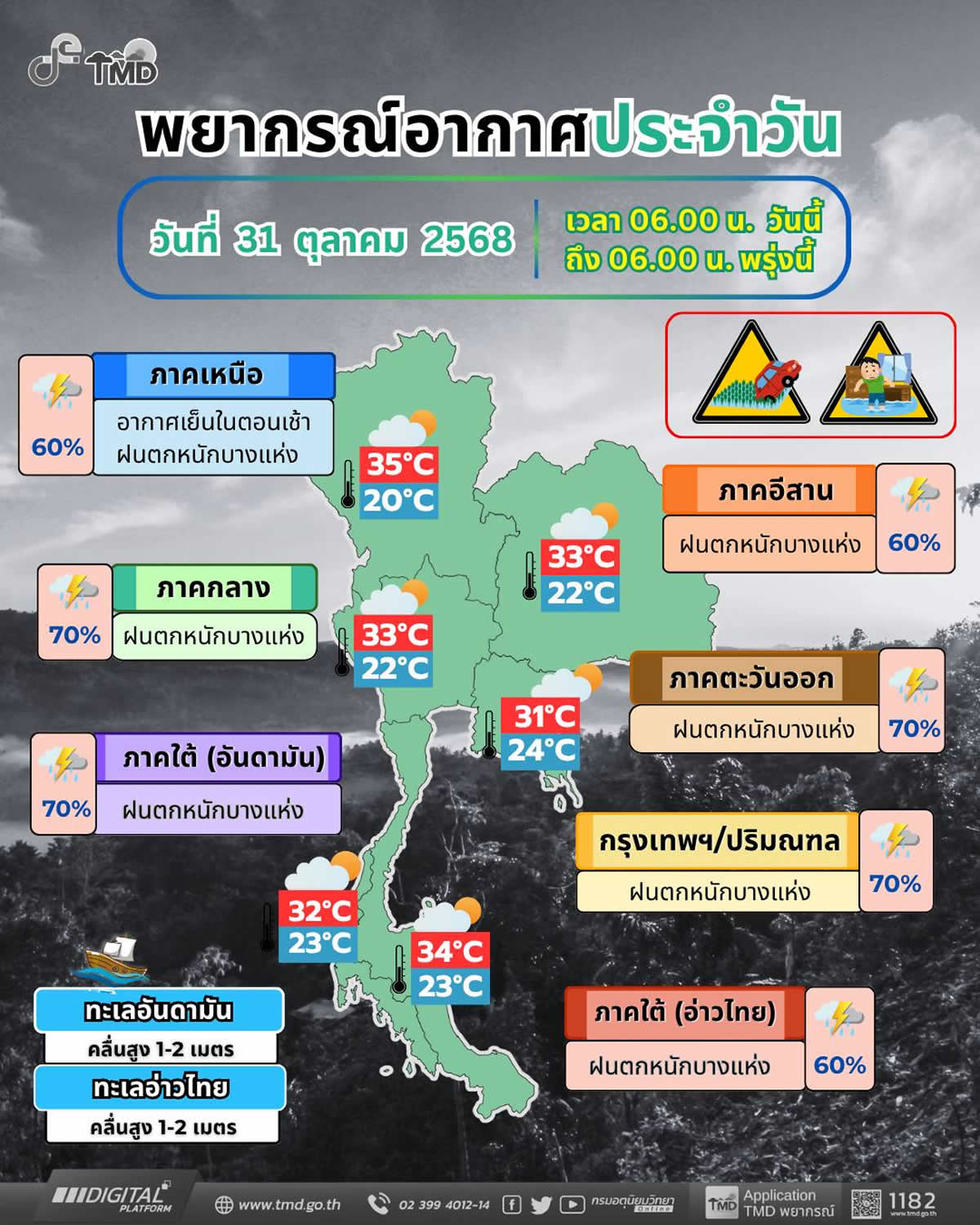 タイ気象局によると、2025年10月31日(金)は、活発な低気圧がタイ湾上部を覆っており、東風によって湿った空気が上部タイに流れ込む見込みです。一方で、高気圧は弱く、北部では東風と南東風がぶつかるため、全国的に雨が多く、
