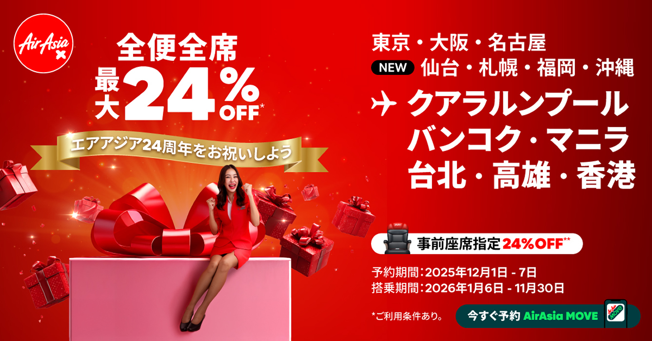 格安航空会社エアアジアは、創業24周年を記念して、2025年12月1日から7日までの7日間、全便・全席を対象に最大24%オフとなるアニバーサリーセールを実施すると発表しました。