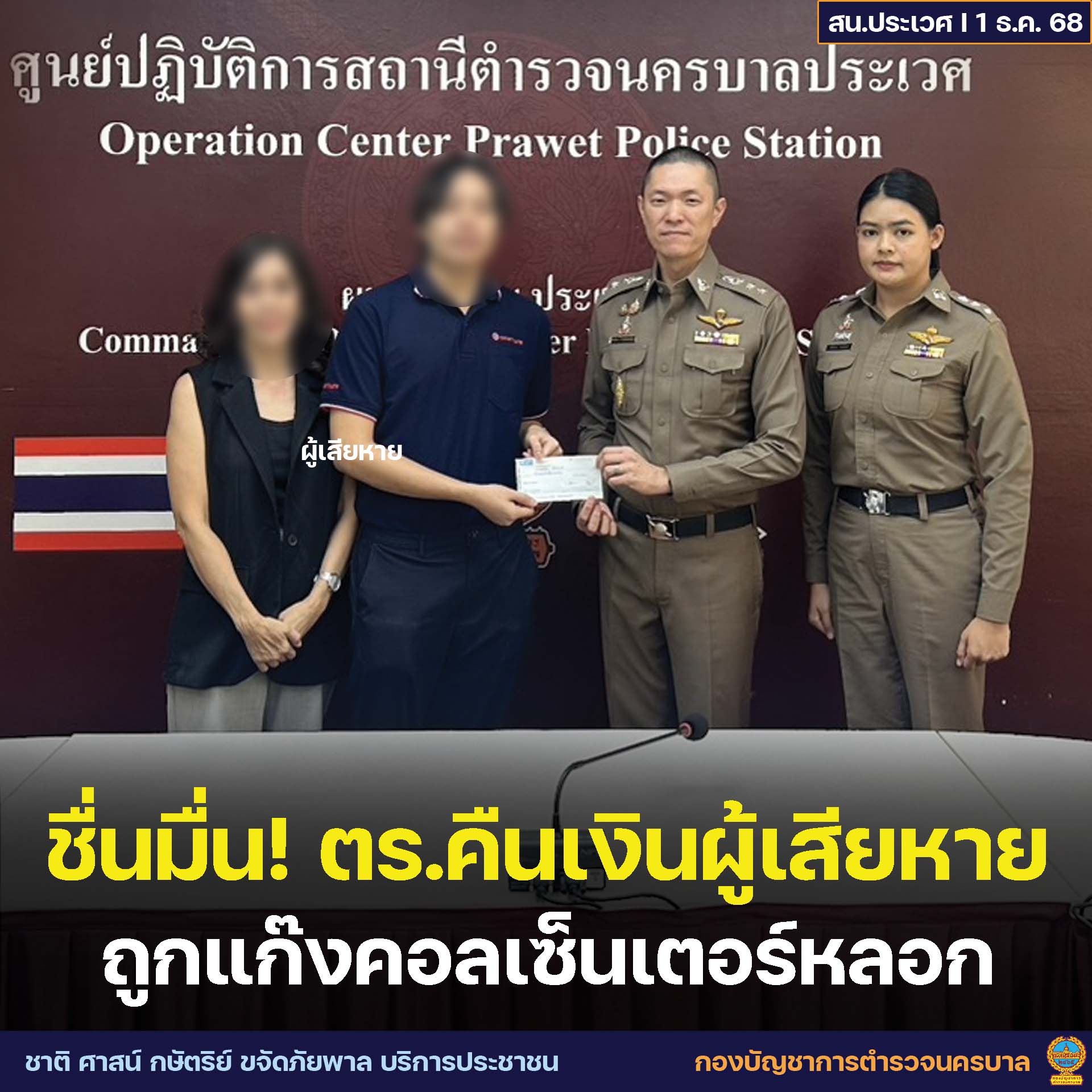 バンコク首都圏警察は2025年12月1日、コールセンター詐欺の被害者に対し、被害金19万バーツを返還したと発表しました。