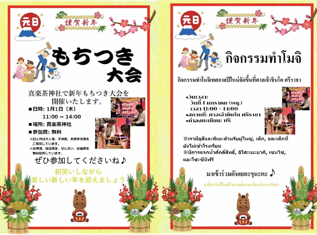 多くの日本人が暮らすタイ東部チョンブリ県シラチャの鎮守の宮である真楽茶神社では、2026年1月1日(木・元旦)の午前11時から午後2時まで、恒例の「餅つき大会」が開催されます。参加費は無料です。