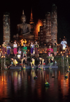 1863年ラマ4世の時代に採り入れられたこのお祭りは、すぐにタイの行事の中でも賑わいをみせるお祭りの1つとなり、今ではタイ人も観光客も楽しめるお祭りとして人気があります。「ローイ」は流すという意味で、「クラトン」はバナナの葉でできた小さな灯篭(とうろう)のことを言います。バナナの葉で作られた灯篭には、お花、お香、ろうそく、がキレイに飾られています。不運を流し、また同時に仏様に敬意を見せるという意味で、お香とろうそくに火をつけて灯篭を川に流します。
