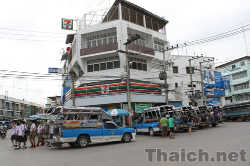 トラックに座席をつけたソンテウ(またはシーロー)と呼ばれるバスに乗り換えて、アンパワー水上マーケットへ向かいます。