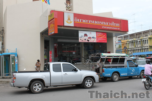 他の目印としては、セブンイレブンの反対に赤い看板の銀行もあります。