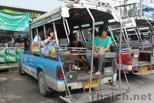 トラックに座席をつけたソンテウ(またはシーロー)と呼ばれるバスに乗り換えて、アンパワー水上マーケットへ向かいます。料金は8バーツで、確か、降りるときに支払うのだと思いました。バスはすぐに人で埋まり14時50分に出発です。