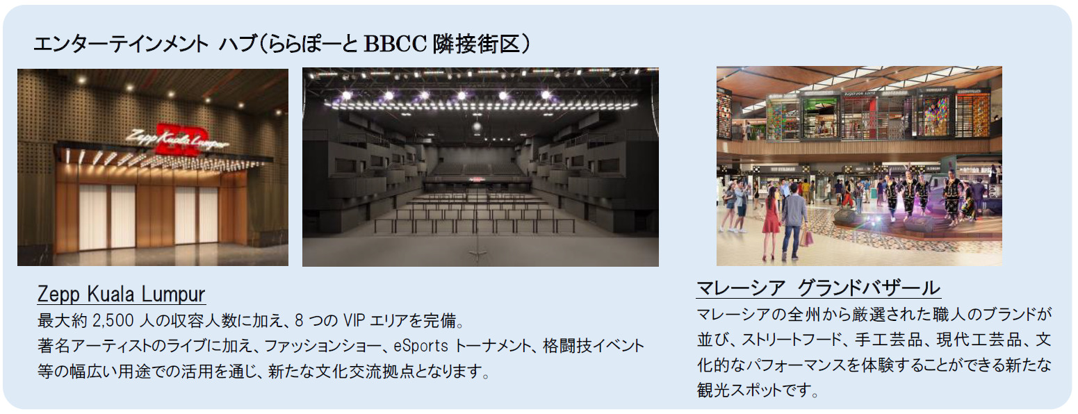 「ららぽーとBBCC」は、クアラルンプール中心市街地において開発が進む、全体敷地面積約78,500㎡の大規模街づくりプロジェクト「ブキッ・ビンタン シティ センター(以下、「BBCC」)プロジェクト」の中心的存在です。「ららぽーと」事業としては、東南アジア初、海外では2021年4月に開業した「三井ショッピングパーク ららぽーと上海金橋」に続く2施設目となります。日本国内の施設を含めても最大規模(店舗面積約82,600㎡)のフラッグシッププロジェクトです。2022年1月20日に開業し、約400店舗が順次オープンいたします。当社は日本国内で培ったノウハウや経験に基づき、上海・台湾含めアジア諸国における商業施設事業を積極的に展開しています。