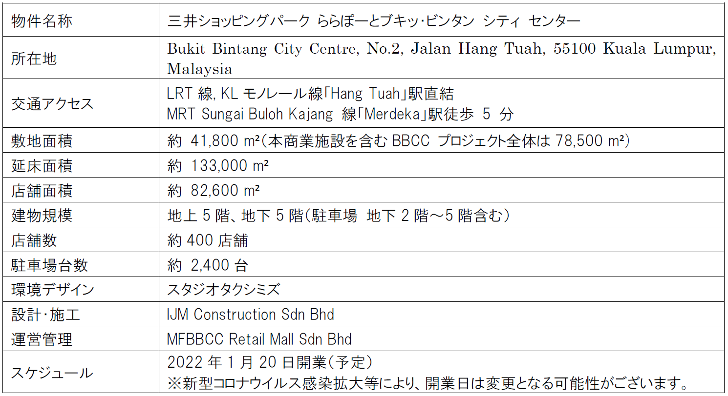 三井不動産株式会社は、マレーシア・クアラルンプールにて商業施設「三井ショッピングパーク ららぽーと ブキッ・ビンタン シティ センター(BUKIT BINTANG CITY CENTRE)」(以下、「ららぽーとBBCC」)を開業すると発表しました。