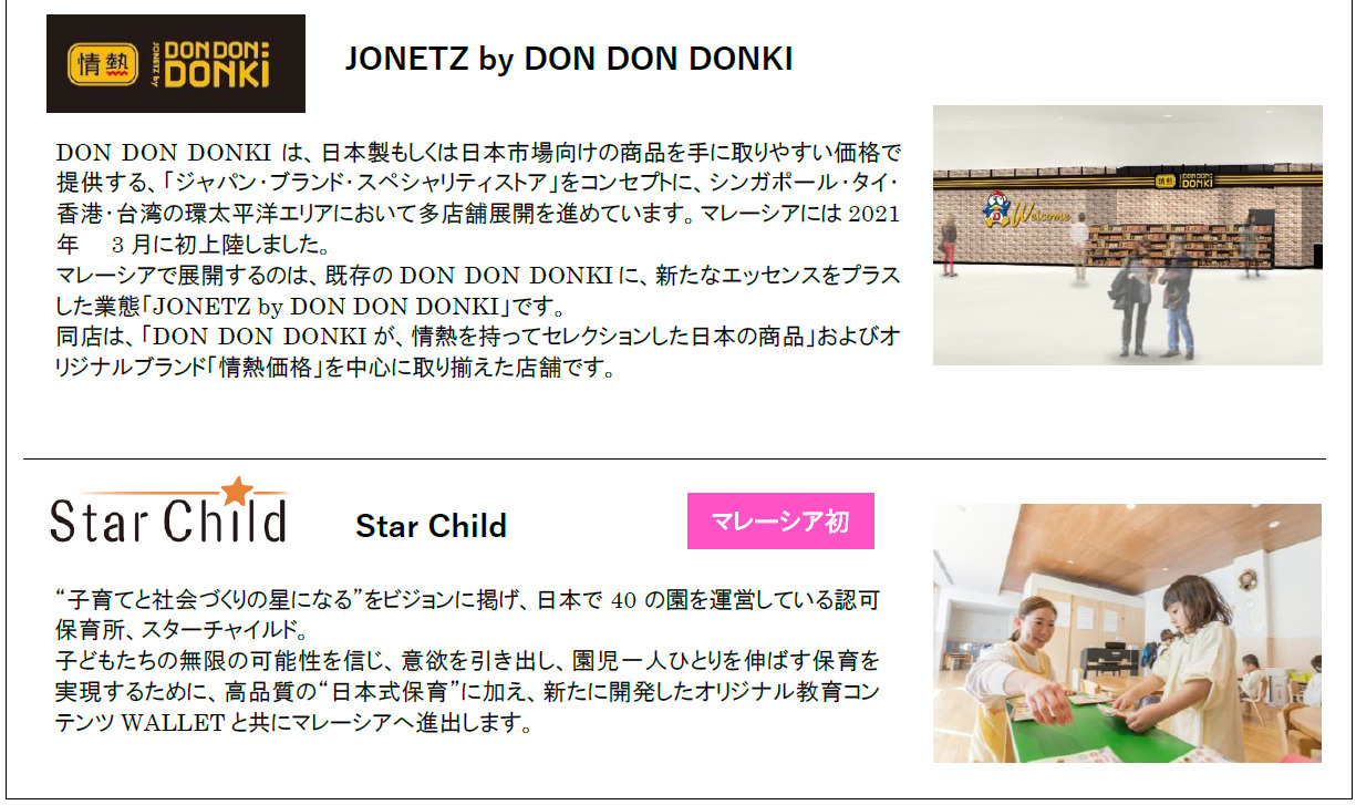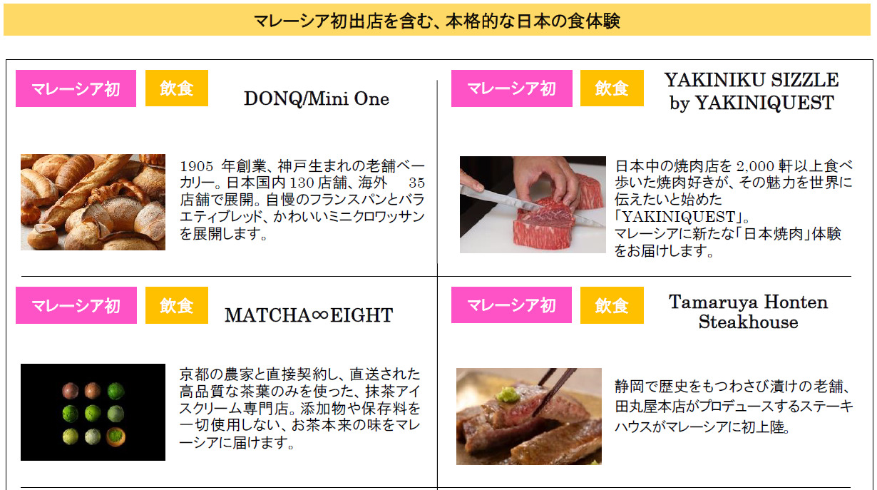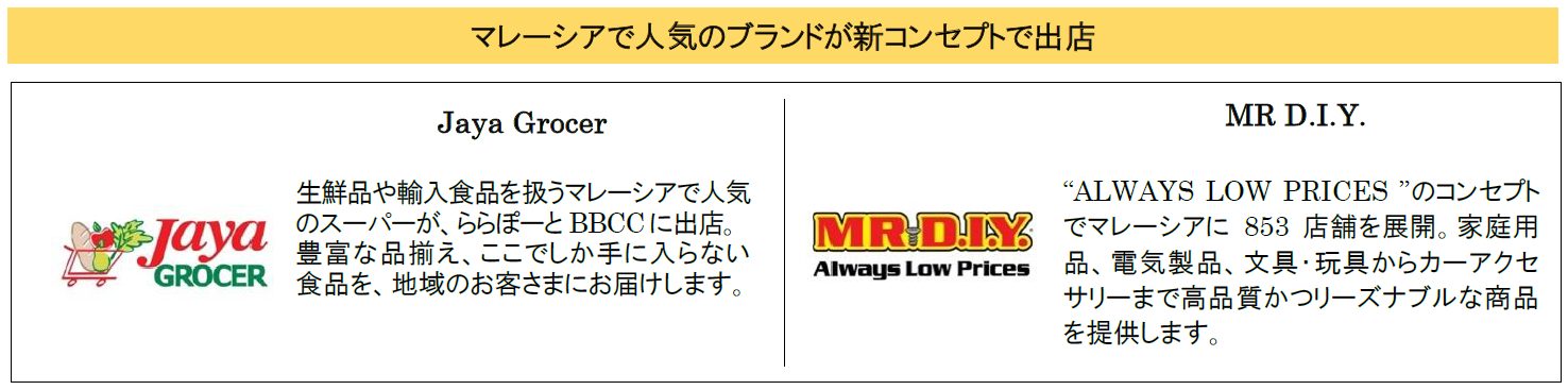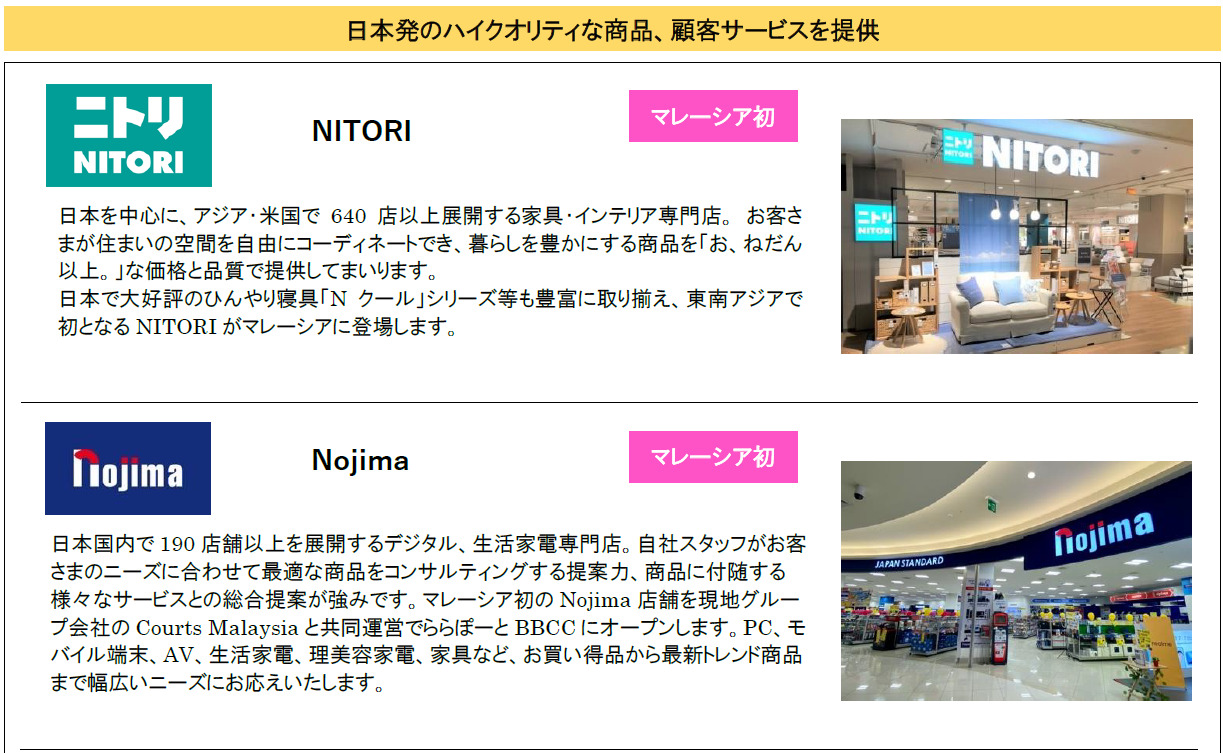 「ららぽーとBBCC」には、グローバルブランドに加えて、日本でお馴染みのNITORI、Nojimaなどマレーシア初出店となる日系ブランド、日本発マレーシア初出店のレストランのほか、マレーシアの人気ブランドが多数出店します。