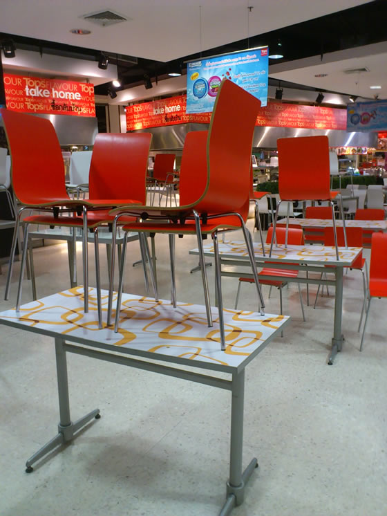 営業を終えた、ショッピングセンターにあるフードコートのお掃除風景。日本人にはちょっと違和感を感じるところですね。日本なら椅子の足が上になるように、椅子を反対にしてテーブルの上に乗せますが、ここでは椅子の足をそのままテーブルに乗せています。日本ではすぐにクレームが入りそうな気もしますが、「タイだなー」とホッとしてしまいます(笑)