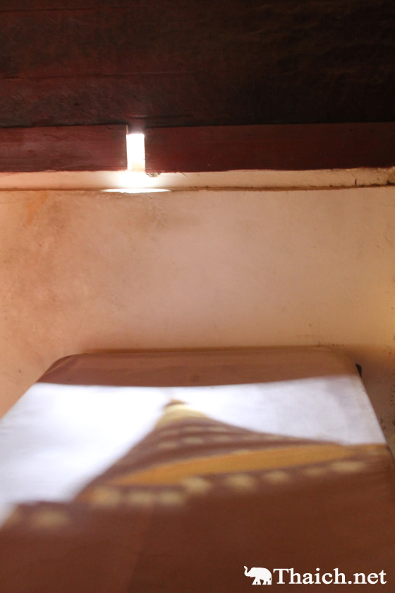 本堂に入ると、壁に小さな穴が開いて外の光が差し込んで仏塔の影が映っているのですが、不思議なことにその影には色が付いているんですね。
