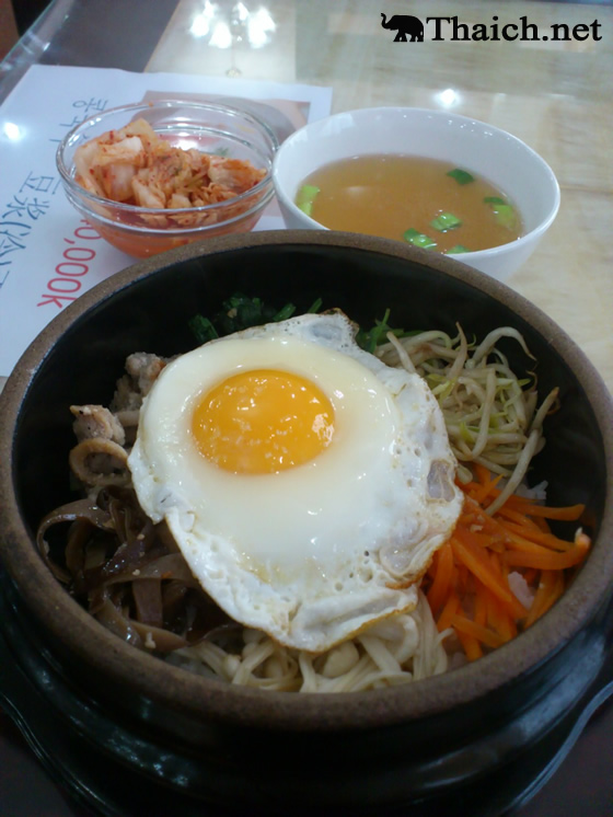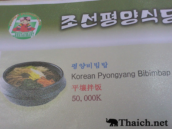 午後2時くらいにお店を訪れると、広々とした店内に北朝鮮出身だという女性美人店員さんが一人だけ。 道路側のガラス窓には黒いフィルムが貼られ、外からは中が見えないようになっているので、ちょっとドキドキ。すぐに席に案内され、店員さんお勧めの平壌ビビンバ(5万キープ、約500円)を注文しました。