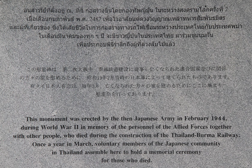 この慰霊碑は、第二次大戦中泰緬鉄道建設に従事し亡くなられた連合国軍並びに関係の方々の霊を慰めるために、昭和19年2月当時の日本軍によって建てられたものであります。