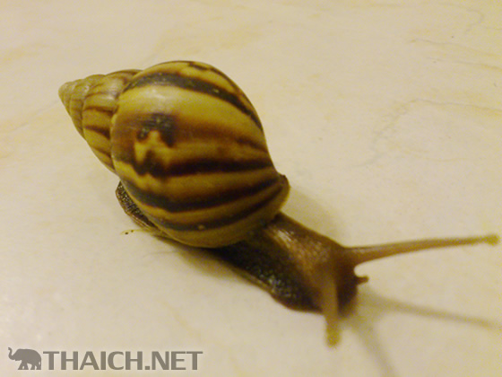 雨季まっただ中のタイ。雨が降ると日本では見る機会の少ない、縦巻き貝のカタツムリが姿を現します。上の写真のカタツムリは「アフリカマイマイ(Achatina fulica)」という種類のカタツムリだそうで、タイではホーイタークヤック(หอยทากยักษ์)と呼ばれています。