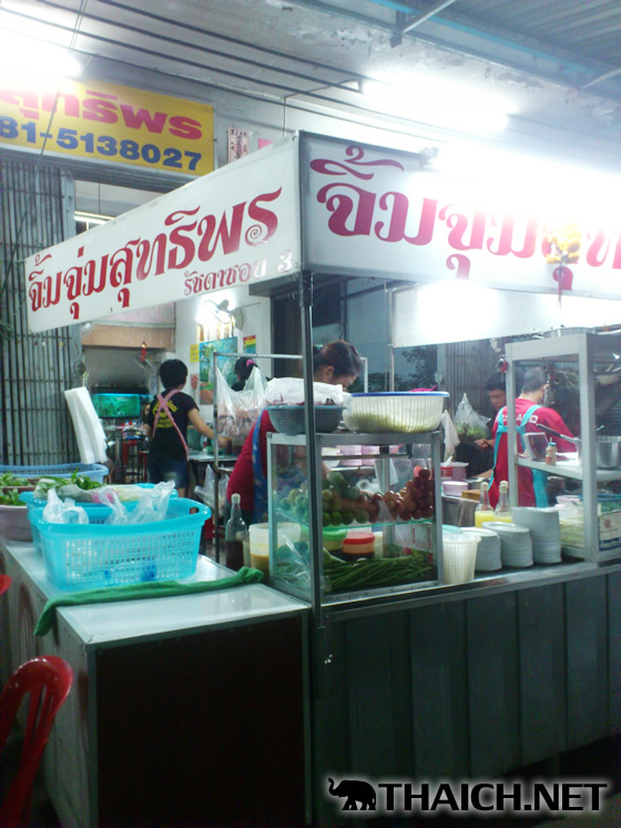 夜のタイの街を歩いていると時々見かけるチムチュム鍋屋さん。タイ東北イサーンの料理だそうですが、バンコクで一番美味しいと評判なのがラチャダーピセーク通りソイ3の奥にある「ラーンチムチュムスティポン(ร้านจิ้มจุ่มสุทธิพร)」。