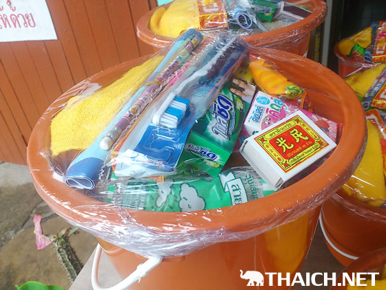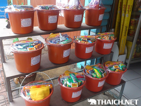 国民の9割以上が仏教徒と言われているタイでは、お寺や祠にお参りしている人々の姿を度々目にします。お寺の周辺やショッピングセンターには、色々な雑貨や食べ物が詰まっている、黄色やオレンジのバケツの「喜捨(タンブン)セット」が売られていて、お参りの時はこれをお寺に納めます。喜捨をすることで、徳を積み、幸せを祈るんですね。