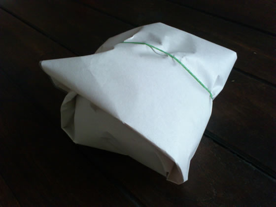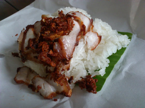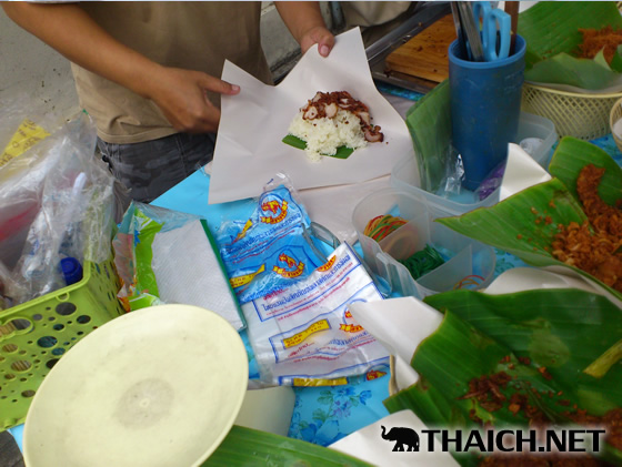 たっぷりのモチ米に濃い目の味付けの豚や鶏のから揚げが乗って、お値段はわずかに20バーツ(約60円)。 地方であればバナナの葉っぱで包むところですが、バンコクでは下敷きのみバナナの葉を使って、紙で包んでくれます。持ち運びも簡単で、汁がこぼれることもないので、通勤前のOLさん達でいっぱい。仕事前にオフィスで腹ごしらえですね。
