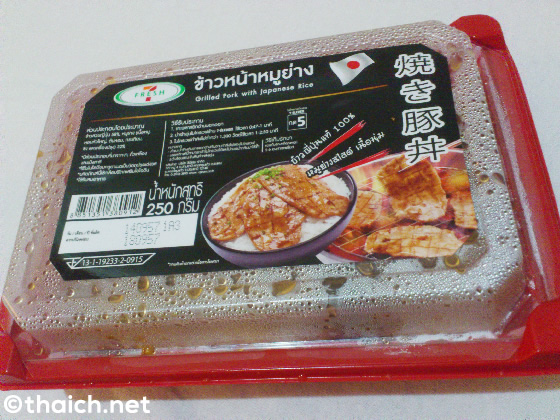 日本のコンビニに比べてお弁当コーナーが寂しいと感じがちのタイですが、セブンイレブンで「焼き豚丼」弁当が売られていたので、日の丸に釣られて買ってみました。フタには「日本米100%」「柔らかいスライス豚肉」と書かれていて期待をそそります(笑)。
