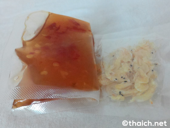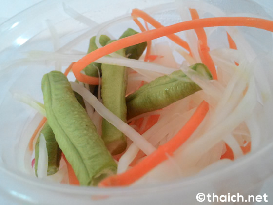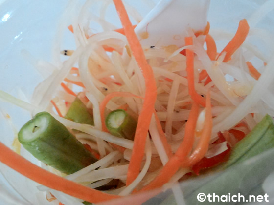 プラスチックのカップに入ったソムタムが25バーツ。中身はパパイヤとニンジンの千切り、インゲン、小エビ、そしてパパイヤソース。これをカップの中で混ぜるだけでタイ中部式の甘目のソムタム・タイの完成です。