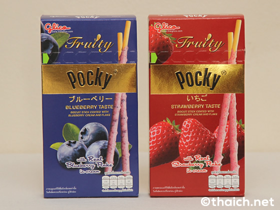 タイにも多くの種類のポッキーが売られていますが、これはちょっと高級なフルーティー・ポッキー。ブルーベリーやいちごのつぶつぶが入った香りも味もフルーティーなこの商品が、新しいパッケージになりました。 これまでの黒ベースからブルーベリーといちごの色になり、魅力度も箱のサイズもアップ。とっても美味しいのでぜひお試しを。1つ25バーツ。