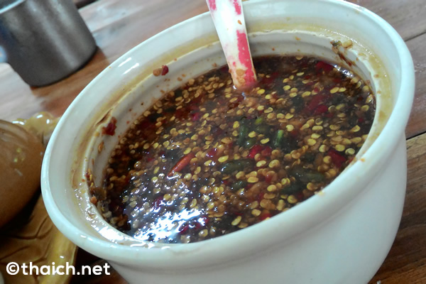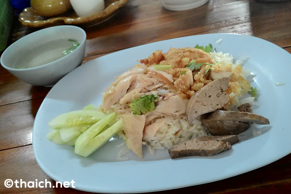 せっかくなのでお腹いっぱい食べたいため、カオマンガイとカオマンガイトード(揚げたもの)を一皿に盛った大盛り55バーツを注文。テーブルに置かれた特製タレをたっぷりかけて、美味しくいただきました。