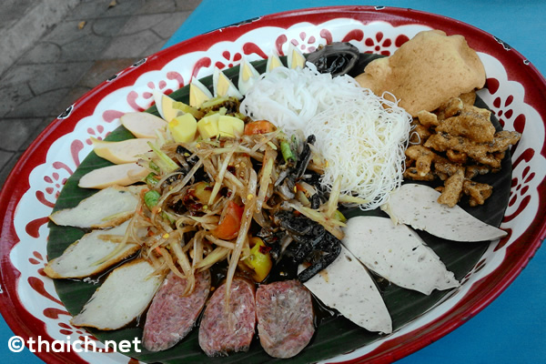 この日に注文したのは大皿に盛られたソムタムに、カノムチンやソーセージなどが盛りつけられたタムコンクルア(ตำก้นครัว)100バーツ。見た目の楽しさだけでなく、もちろん味のバッチリなのでバンセーンビーチまで足を伸ばす機会があれば、ぜひお試しを!