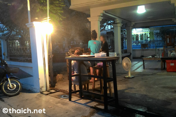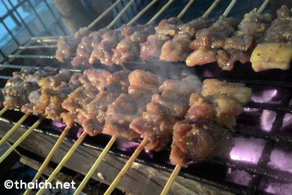 タイ東部バンセーンのセンスック学校近くの豚の串焼き(ムーピン)のお店。新規にオープンするに当たって、目玉商品として開発したのがグリーンカレー味の豚の串焼き・ムーピンロットゲーンキアオワーンです。