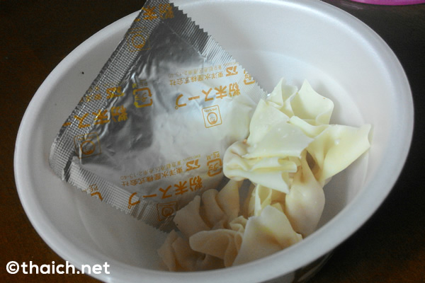 お湯を入れて待つこと三分。まずはスープから。これはココナッツミルクの入っていないあっさりスープの、トムヤムナムサイですね。スプーンで一口すすると・・・、確かにあの辛くて酸っぱいトムヤムスープですが、本場のトムヤムを食べ慣れていると、何かが足りないような気がします。続けてワンタンを一つ。これは旨い。さすがマルちゃん。どうやらスープとワンタンを同時に食べ進めるのが良さそうです。