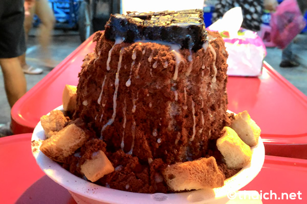 シロップやココア飲料MILOのパウダーを染み込ませた山盛りのかき氷に、更にMILOのパウダーを氷の部分がほとんど見えなくなるくらい振りかけ、火口部分にはドカンとブラウニーを乗せ、そこに練乳をタップリとかけて、山の麓にパンをトッピングして出来上がりです。