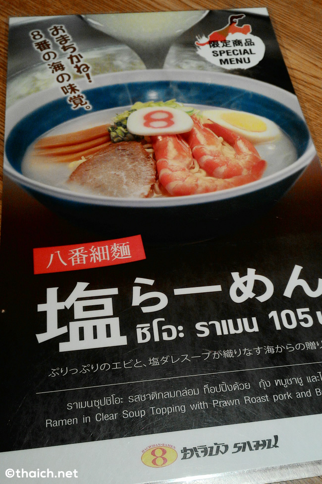 日本発のタイNo1ラーメン店チェーン、8番らーめんの店頭に、限定発売中の新製品「塩ラーメン」のポスター発見。大きな海老の写真につられて注文してみました。