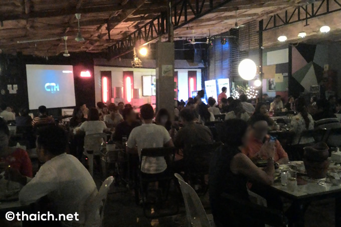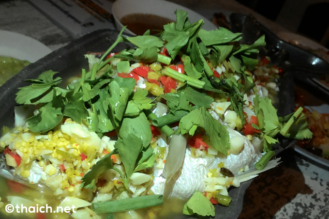 夜の8時過ぎ、平日だというに広い店内は老若男女でほぼ満員。「これは間違いなく美味しいのだろう」と確信しました。ちょうど空いた席に座ってメニューを見てみると、これがまた安い。例えばビールは大瓶のハイネケンが90バーツ、LEOが75バーツ。ソムタムは50バーツで、ラープは55バーツ。各種野菜炒めも70バーツほどで、大きな魚料理でも300バーツ前後。このお手頃価格も人気の秘密なんですね。