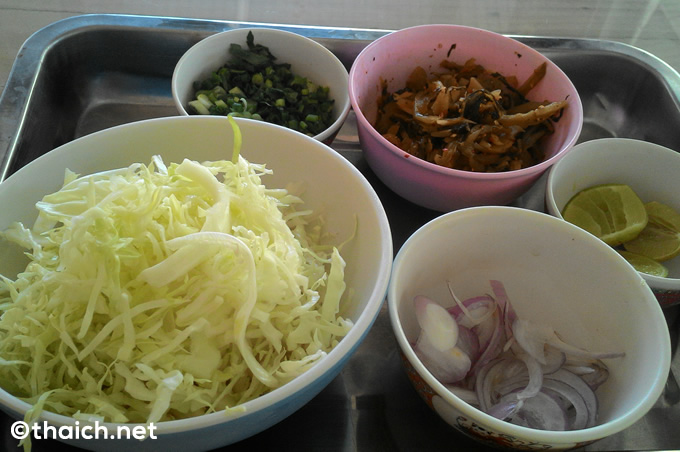 カオソーイで嬉しいのが野菜のトッピング。キャベツの千切りや玉ねぎのスライスなどが入れ放題なので(※お店によっても異なります)、麺と同じ量位の野菜を入れてしまいます。タップリキャベツをスープに浸して、シナシナになったところを食べるのがカオソーイの楽しみの一つなのです。