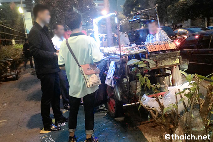 串焼きは一本10バーツ。モチ米は一袋5バーツ。食べる前に取った分だけ支払うことも可能ですが、自己申告の後払いもOKです。お客さんは男性ばかりで、女性が立ち食いをしている姿を見ることはあまりありませんが、女性の方もぜひチャレンジを!