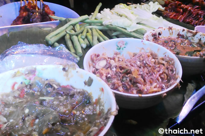 バナナの葉っぱの上に並べられた炭火焼きの豚串(ムーピン)や焼き鳥(ガイピン)と、モチ米(カオニャオ)を一緒に食べるのがタイ式。立ち食いのお店で嬉しいのが、モチ米や無料で食べ放題の野菜につけるナムプリックやプラーサップといった、つけダレや味噌のようなものが用意されていることです。串焼きが美味しいのはもちろんですが、このナムプリックやプラーサップが食べたくて足を止めるんです。