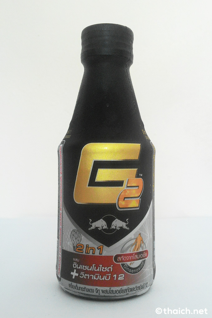 真っ黒のパッケージの「G2」には、なんと朝鮮人参のジンセノサイドが配合。加えて12種類のビタミン入りということなので、いかにも力が湧いてきそうな気になります。一本15バーツとこれまでの「クラティンデーン」よりも高めの価格設定ですが、飲む価値はありそうです。