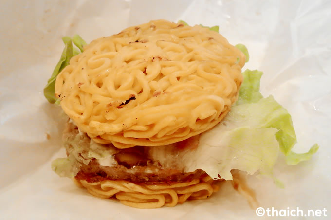 「わざわざラーメンをハンバーガーにすることないのに、普通のバンズでいいのに・・・」と思いながらもカウンターで注文して支払い。黒豚のラーメンバーガーセットが通常125バーツ(約430円)のところ、プロモーションで105バーツ(約360円)でした。そうです。プロモーション中だったので「試しに食べてみよう」となったのです。