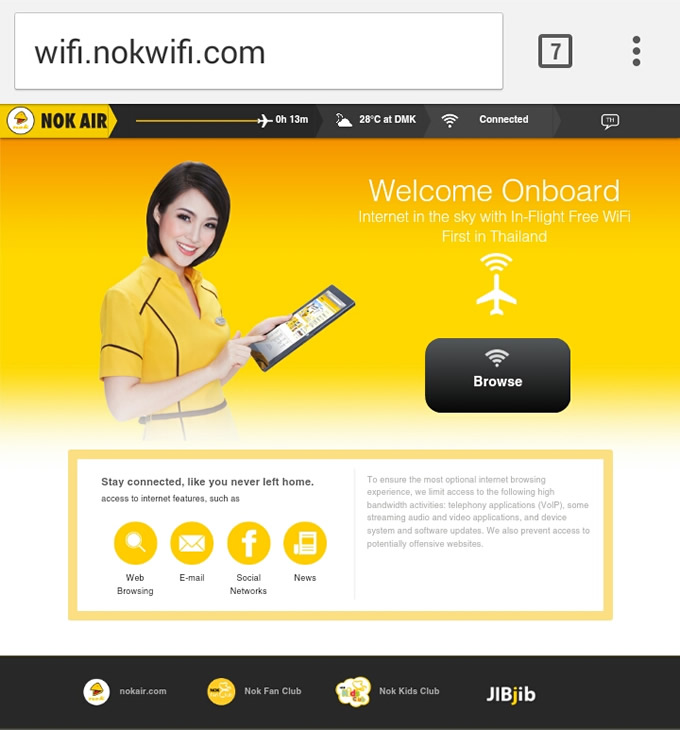さらに今回思いがけずに嬉しかったのが、フライト中の機内でインターネットの利用が可能になっていたこと。これまでもノックエアは地上では予約番号でログインする無料のインターネット接続サービスを行っていましたが、フライト中までもが無料でインターネット接続サービスとは恐れいりました。接続も「Nok WiFi」を選ぶだけで簡単。ネットサーフィンも、メールも、LINEもバッチリ利用が可能です!