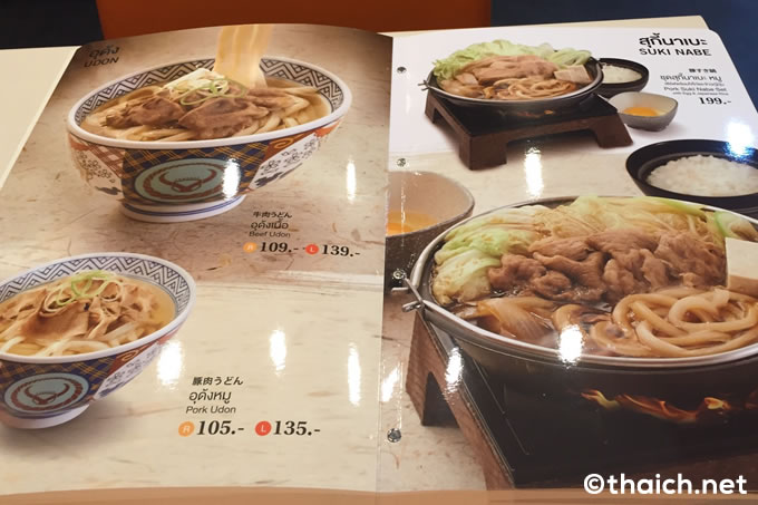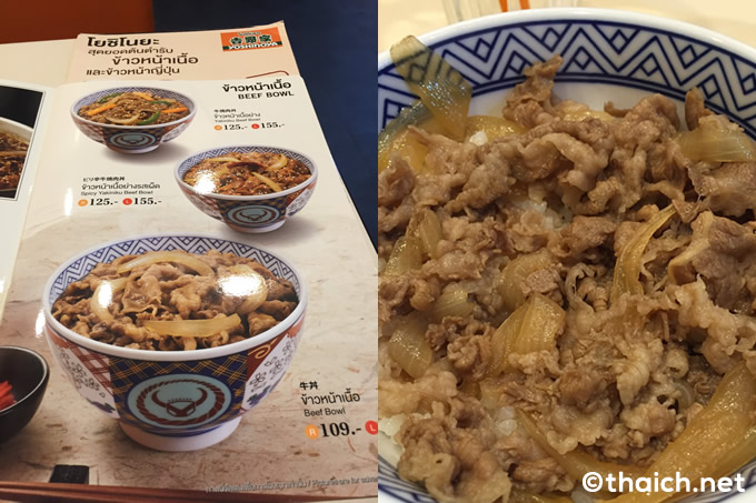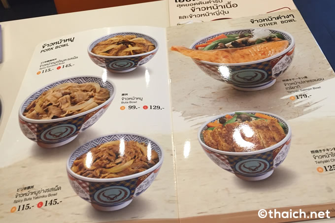 タイの「吉野家」は日本と違って、テーブル席が主体でファミリーレストランの様な形態。メニューも牛丼以外に豚丼やサーモン丼、チキン丼も。